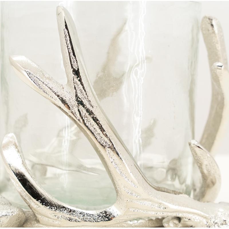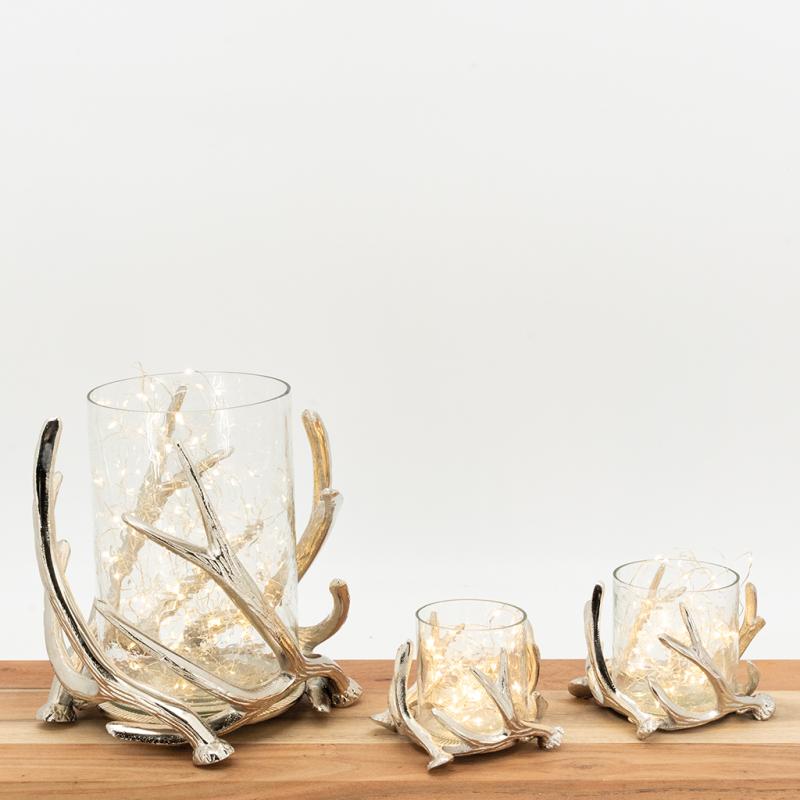 A decorative piece with a refined style, perfect for creating a warm and natural atmosphere. An openwork aluminium frame, adorned with an elegant, finely crafted deer antler. A transparent inner glass holder, designed to safely hold a tea light or a cylindrical candle. A subtle play of shadows cast by the light, creating a soft and enveloping atmosphere. A beautiful combination of metal and light, ideal for interiors with a chalet, natural or contemporary feel.