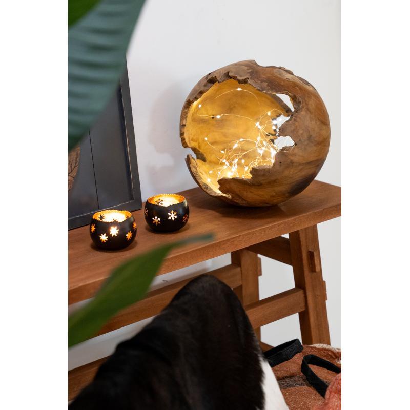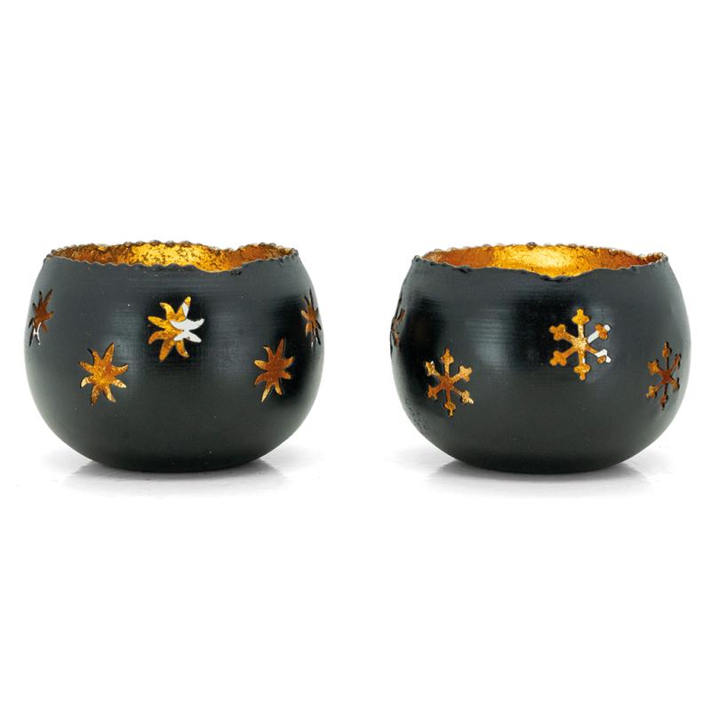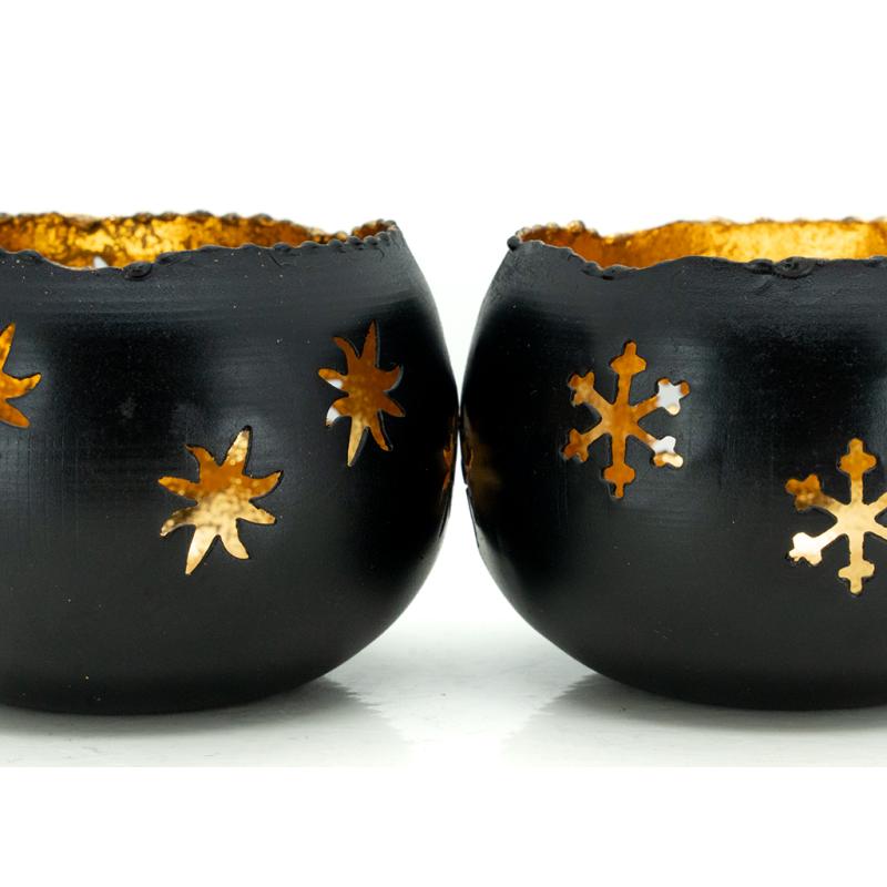 A small, round candle holder in black lacquered metal, enhanced by a gold interior and elegant Edelweiss or snowflake cut-outs. Perfect for creating an intimate and sophisticated atmosphere