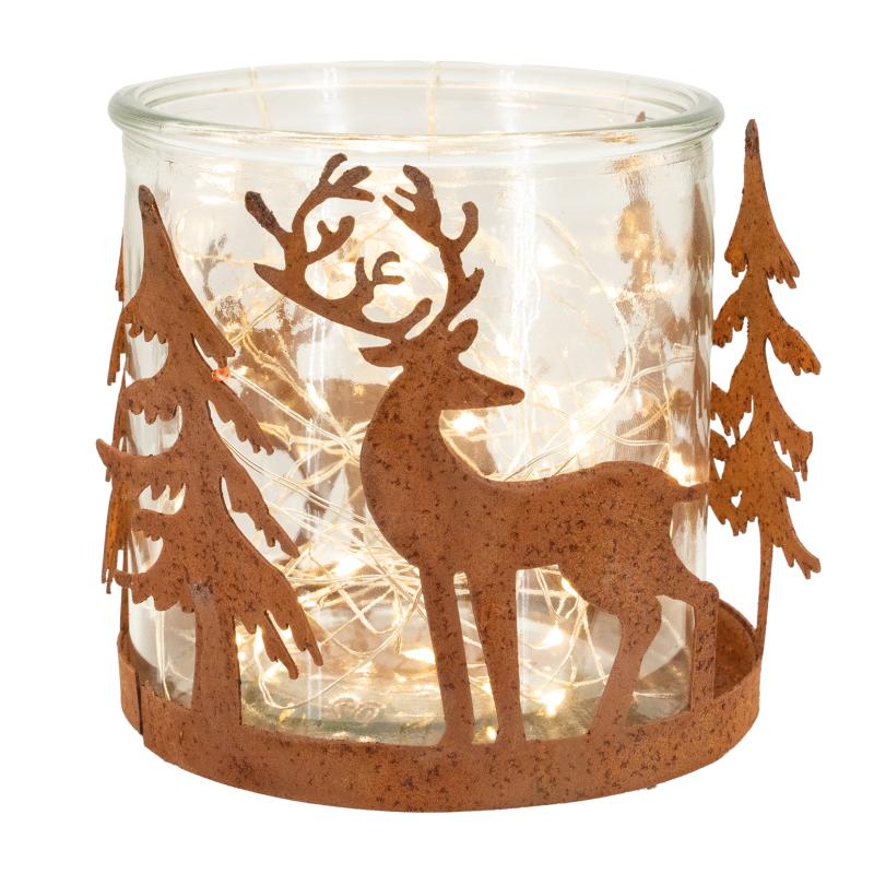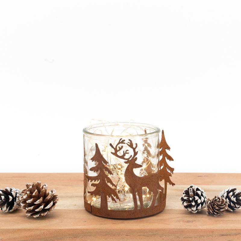 A round metal candle holder with a rust-effect finish, enhanced by an elegant design featuring deer and fir trees. Elegant and warm, it creates an authentic and cosy atmosphere.