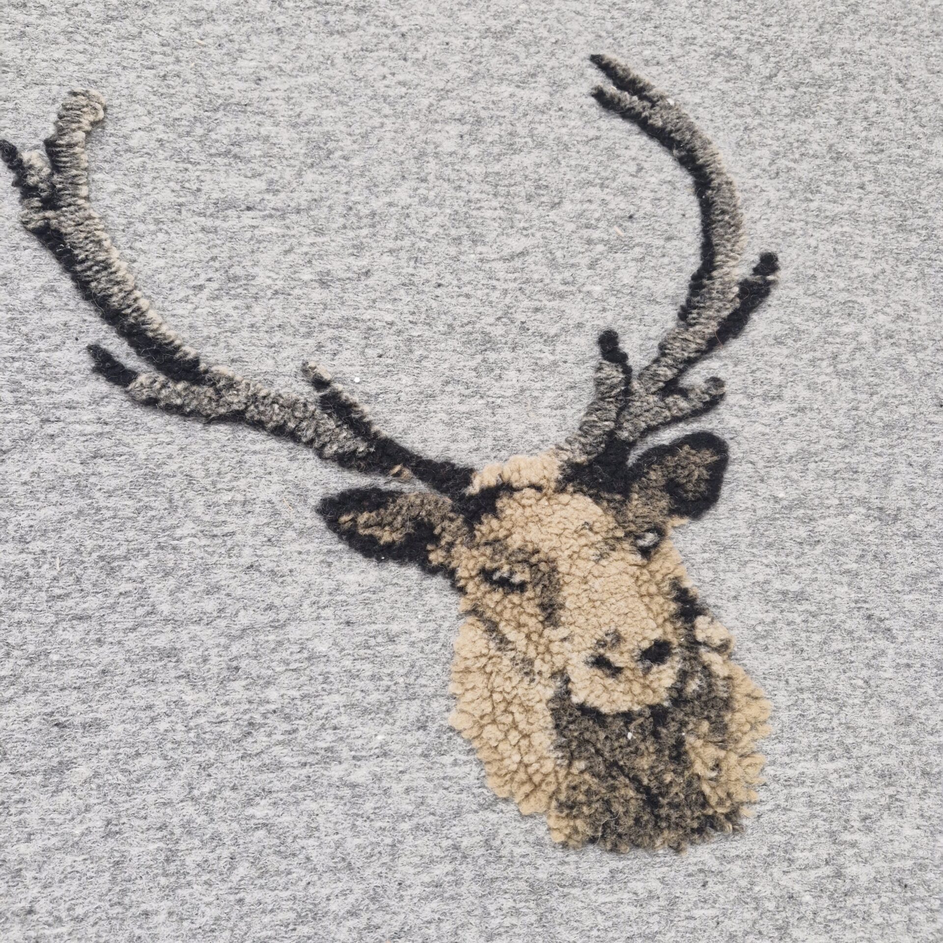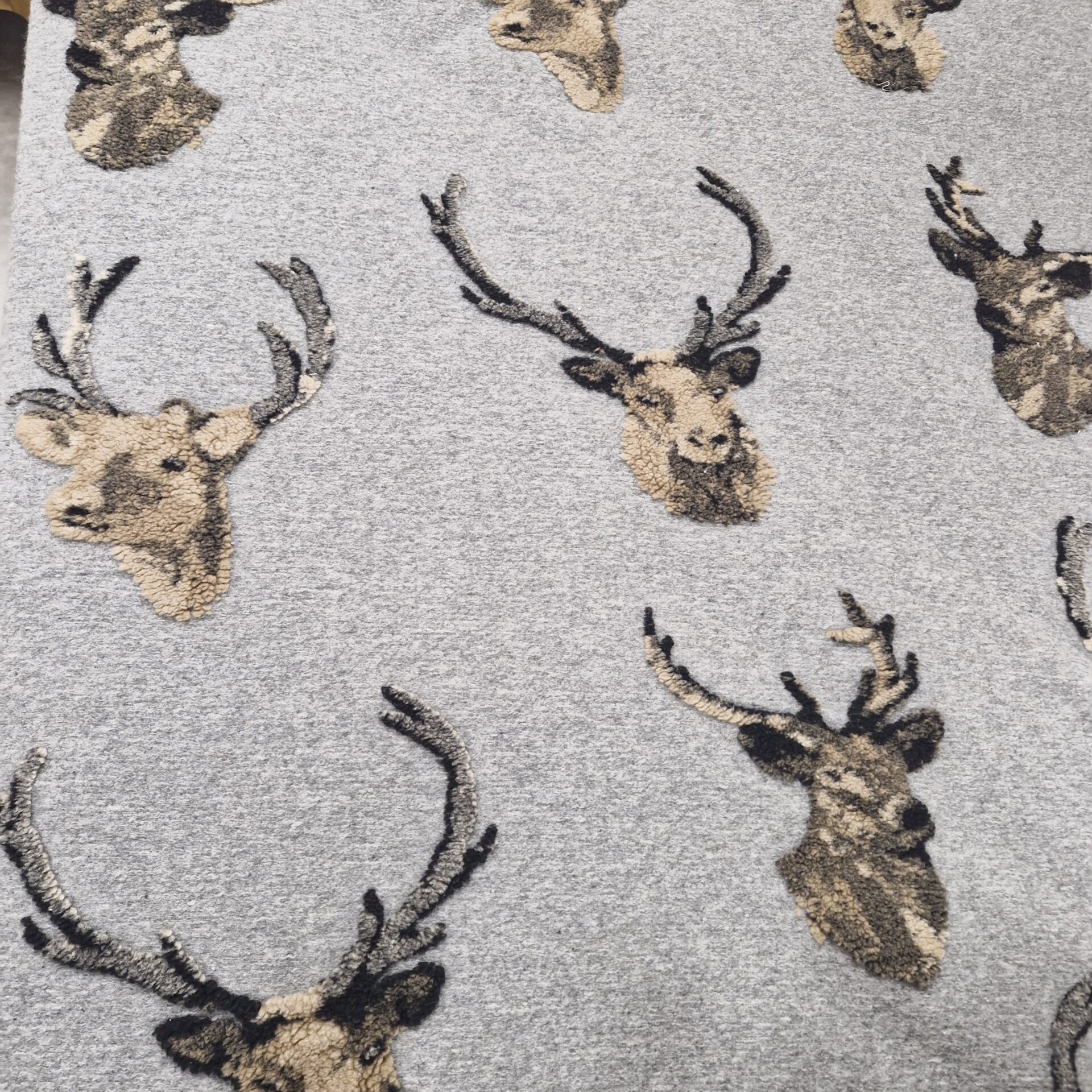 A grey throw featuring embossed stag heads in shades of brown and black across the entire surface. An expressive and warm design that adds a distinct natural touch whilst retaining a sense of understated elegance.