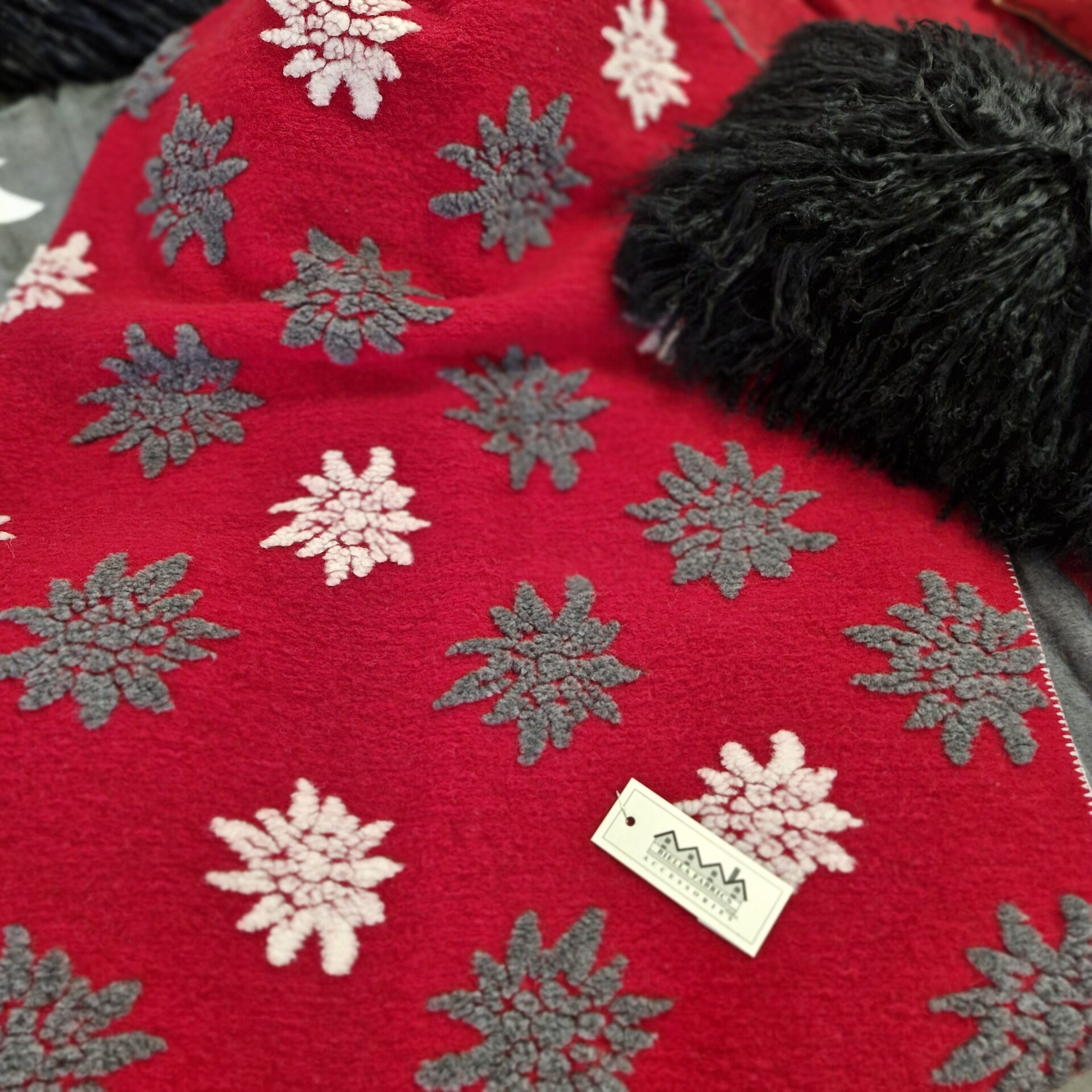 Un plaid au fond rouge chaleureux, habillé de motifs edelweiss blancs et gris répartis sur toute la surface. Un style alpin classique revisité avec contraste et relief, idéal pour une ambiance chaleureuse et authentique.