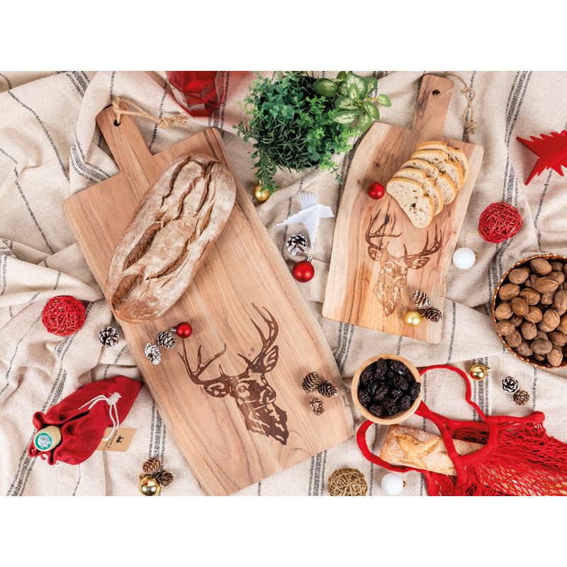 This acacia wood board combines durability with natural elegance. A delicate engraving of a stag’s head adds a decorative touch to its authentic charm. The hard-wearing surface is ideal for cutting or serving. The wood’s rich grain gives each piece a unique appearance.