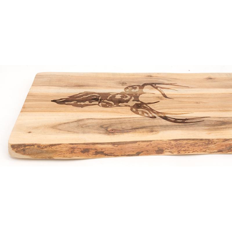 Large acacia wood chopping board with a laser-engraved deer design.