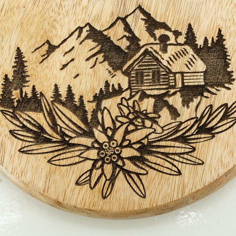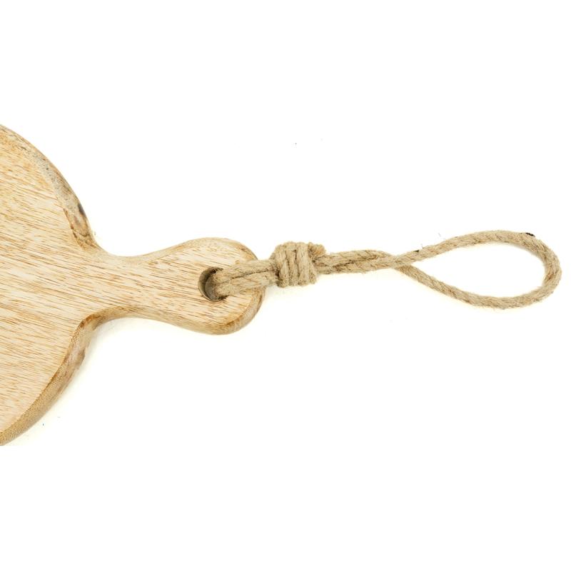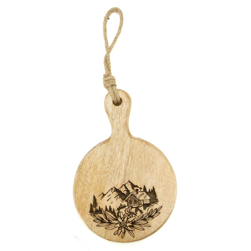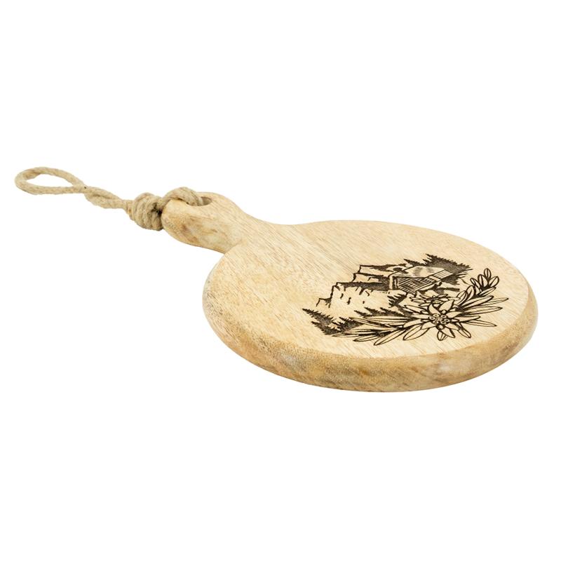 Planche à découper ronde en manguier Décor cerf gravé, avec anse bois de cerf et cordelette. Lavage à la main recommandé, pas de lave vaisselle.