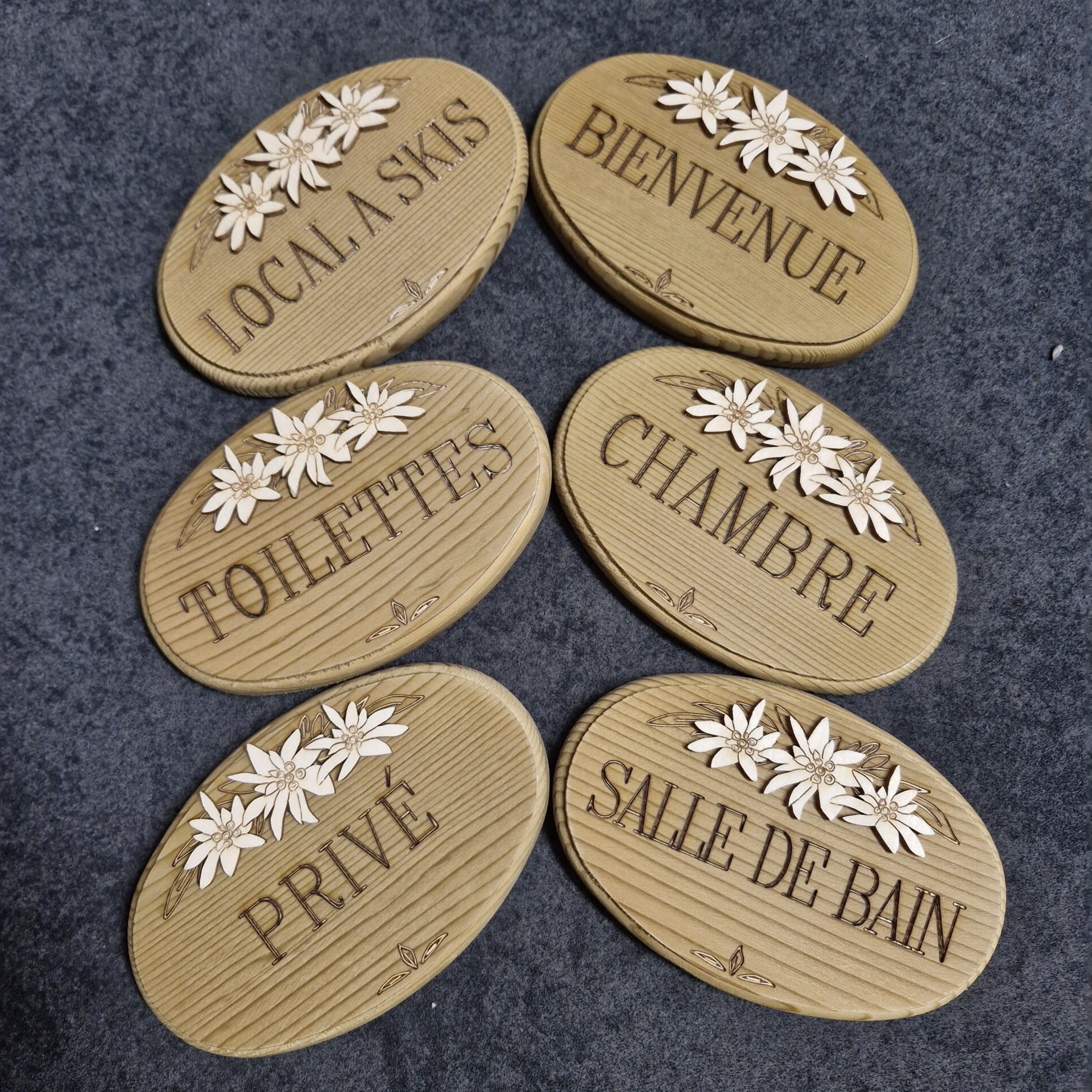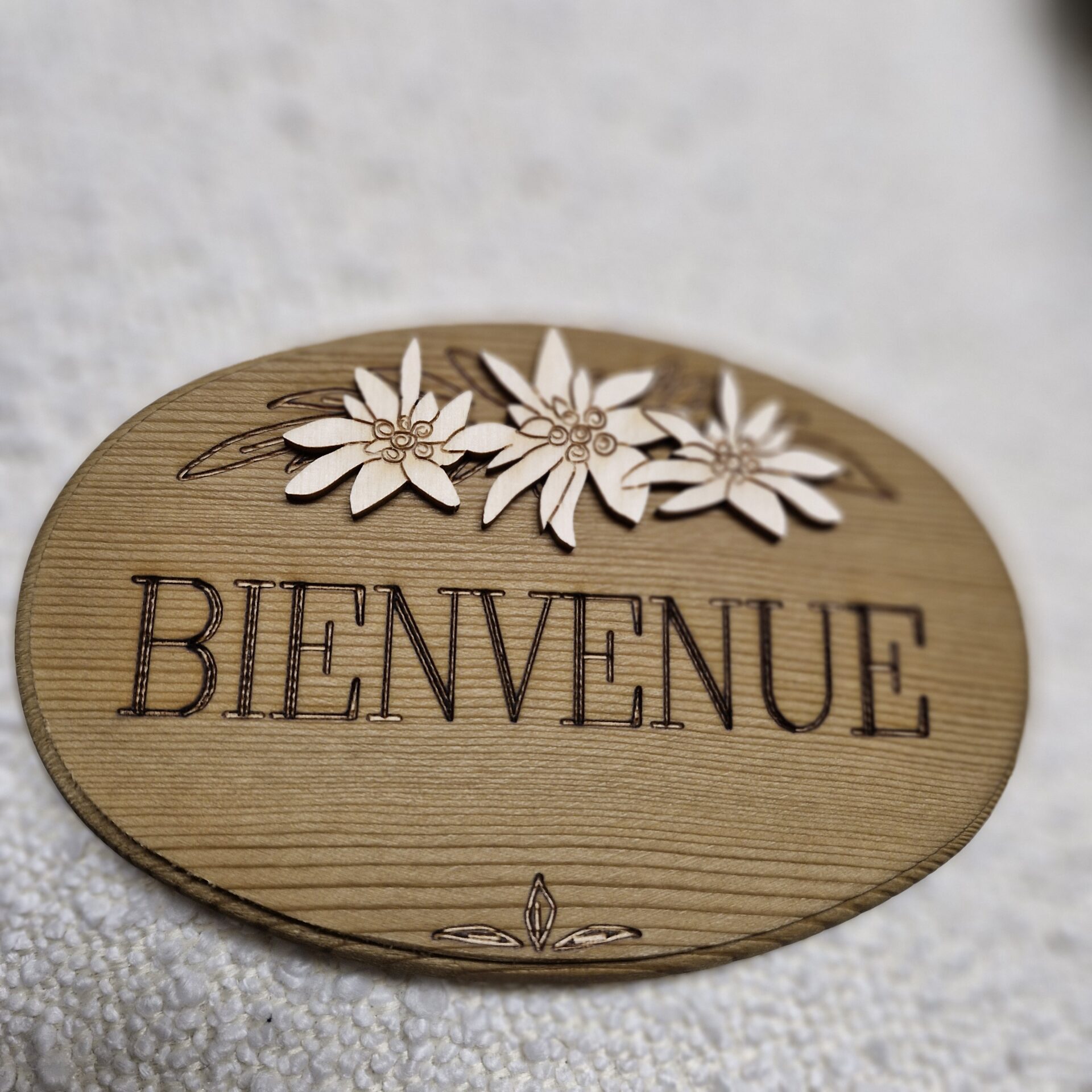 Plaque de porte en sapin Décor 3 edelweiss en relief Forme ovale Inscription Bienvenue Fixation scotch double face