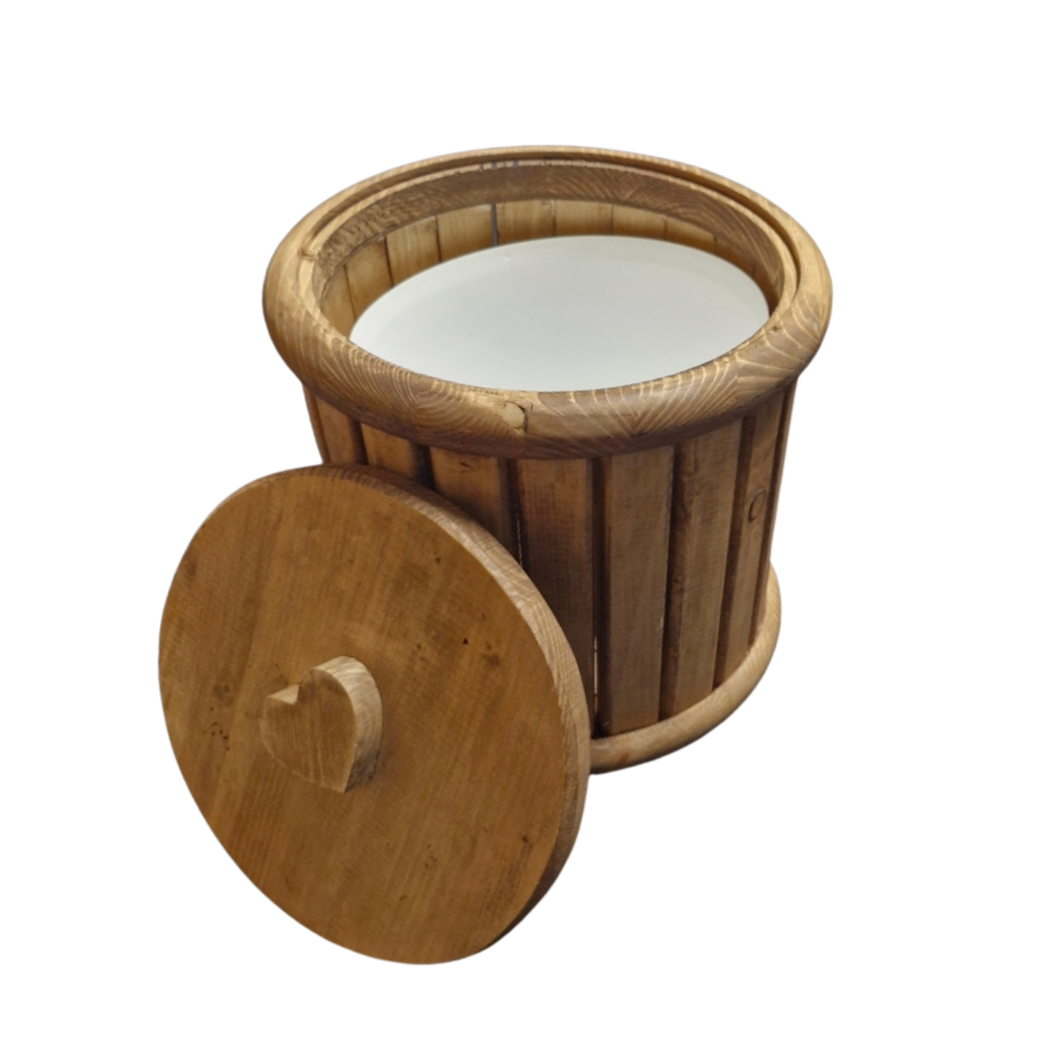 Poubelle ronde en bois ciré avec bac plastique amovible et couvercle en bois, doté d’un bouton en forme de cœur. Design élégant et chaleureux, adapté à la salle de bain, chambre ou espace toilettes.
