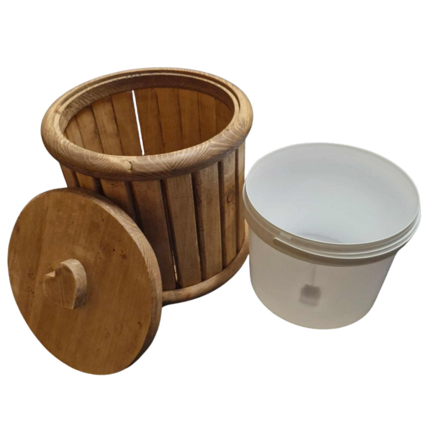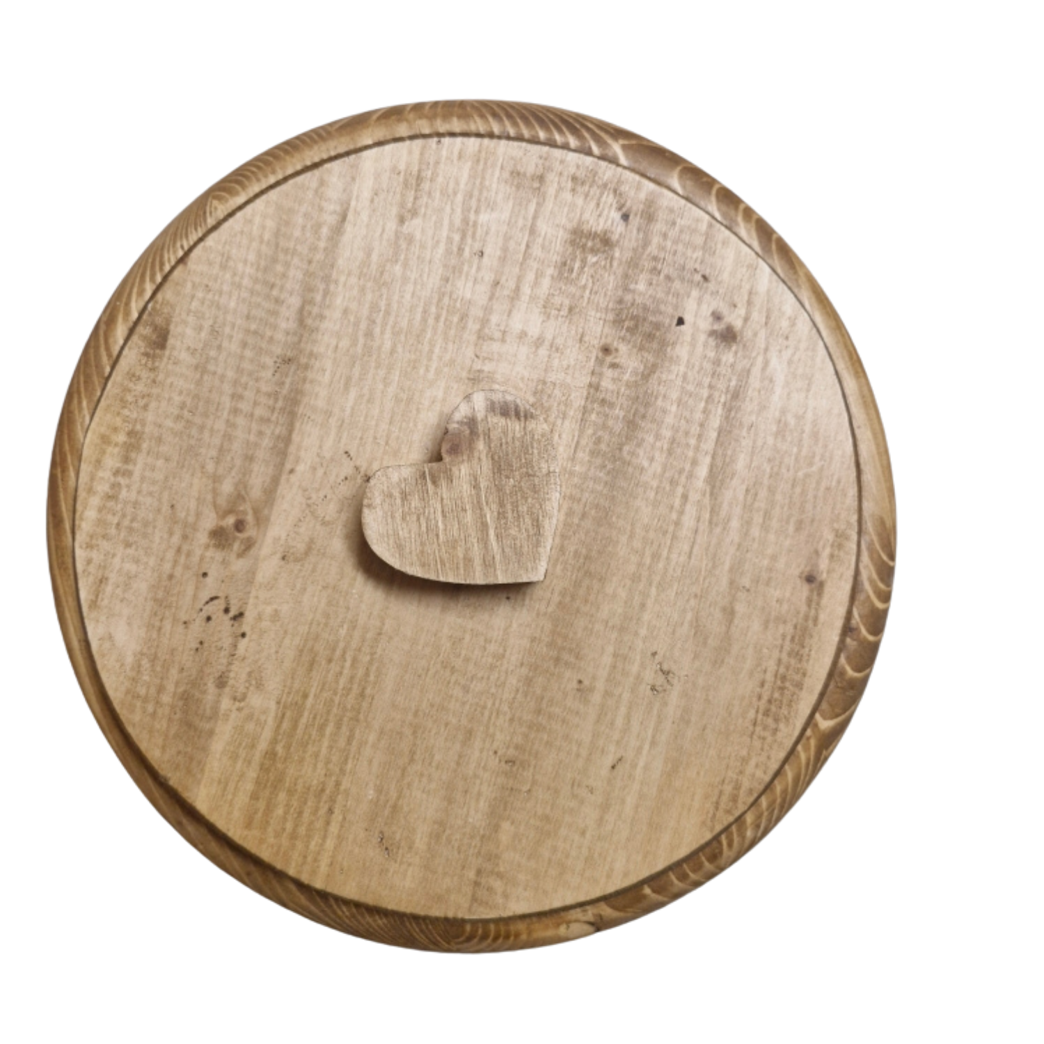 Round waste bin in waxed wood with removable plastic bin and wooden lid, featuring a heart-shaped knob. Elegant, warm design, suitable for the bathroom, bedroom or toilet area.