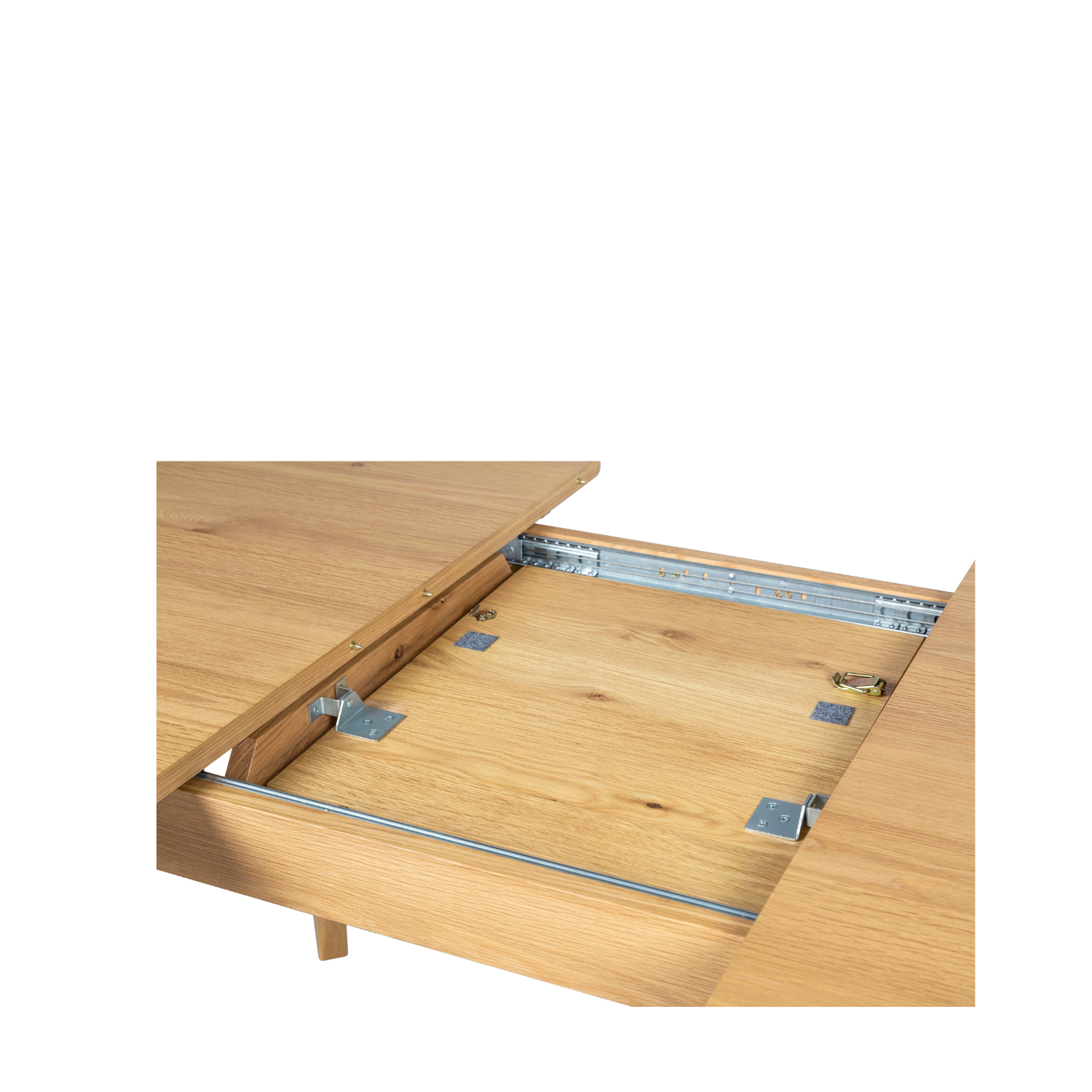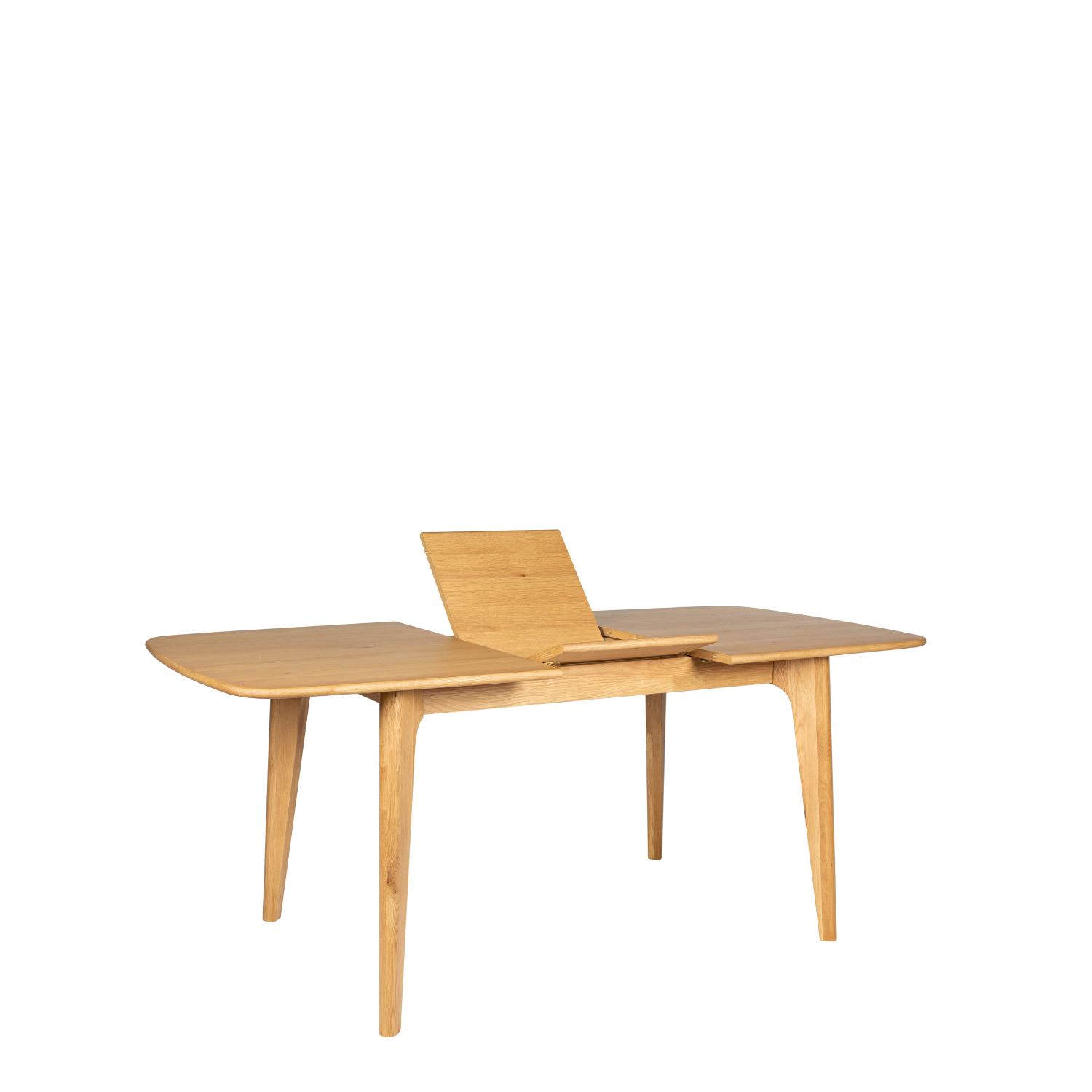 A Scandinavian-style extendable table for 8 people with 1 retractable extension leaf integrated under the top.