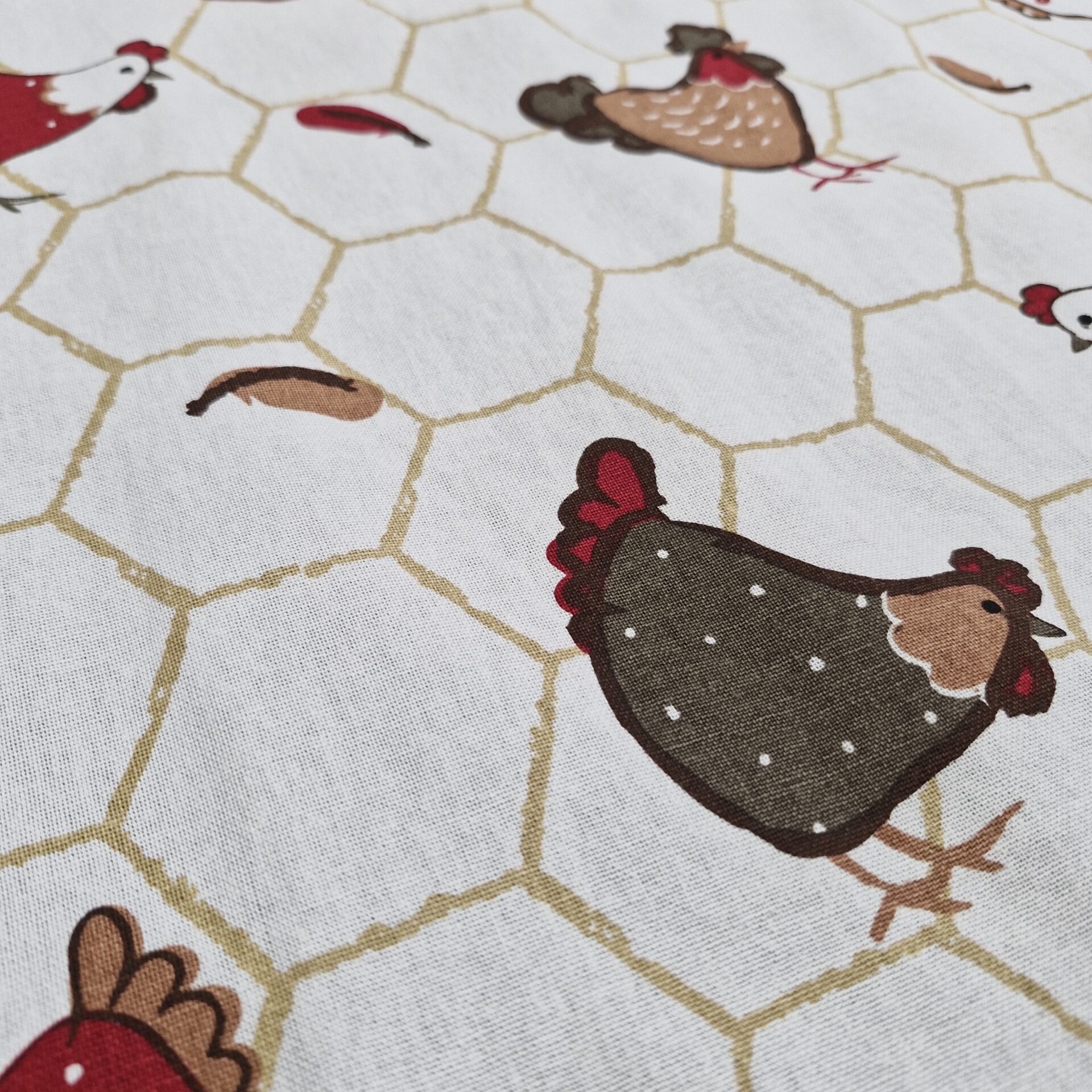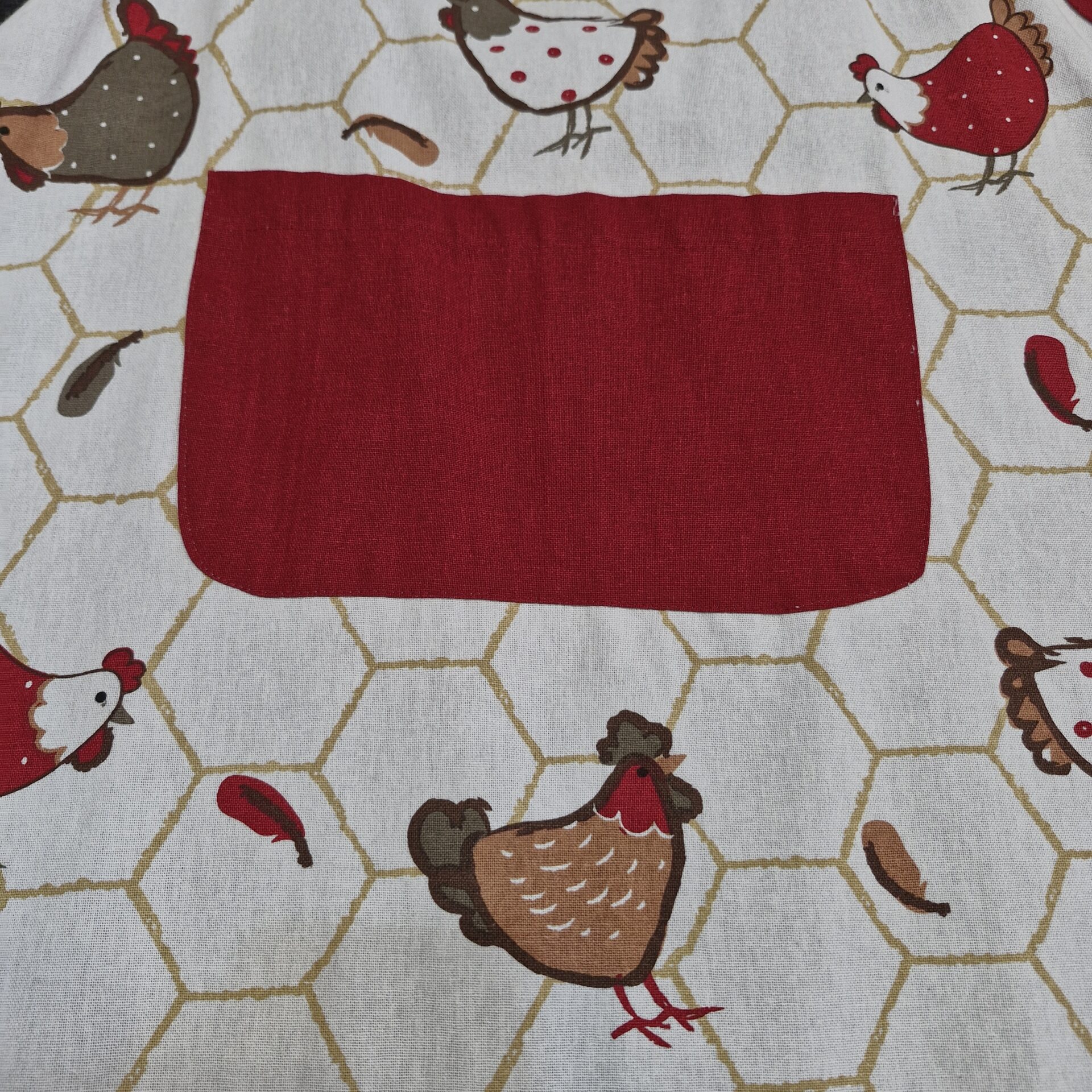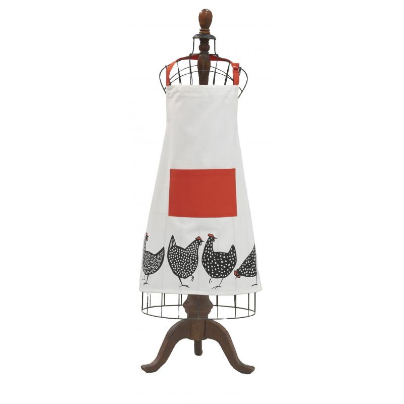 A white apron featuring a honeycomb and hen pattern, with a red central pocket and matching trims (edging and ties). A warm, rustic design, perfect for adding a touch of character to your kitchen.