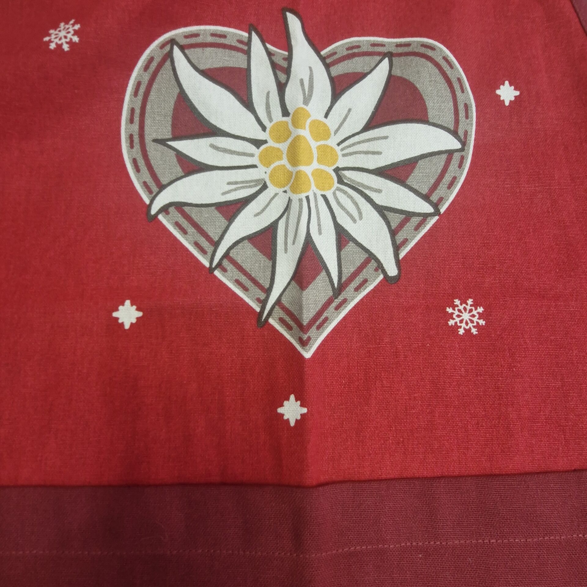 A red apron featuring a large heart motif with edelweiss, complete with a central pocket and delicate white snowflakes scattered across it. A warm, mountain-inspired design, perfect for adding an authentic touch to the kitchen.