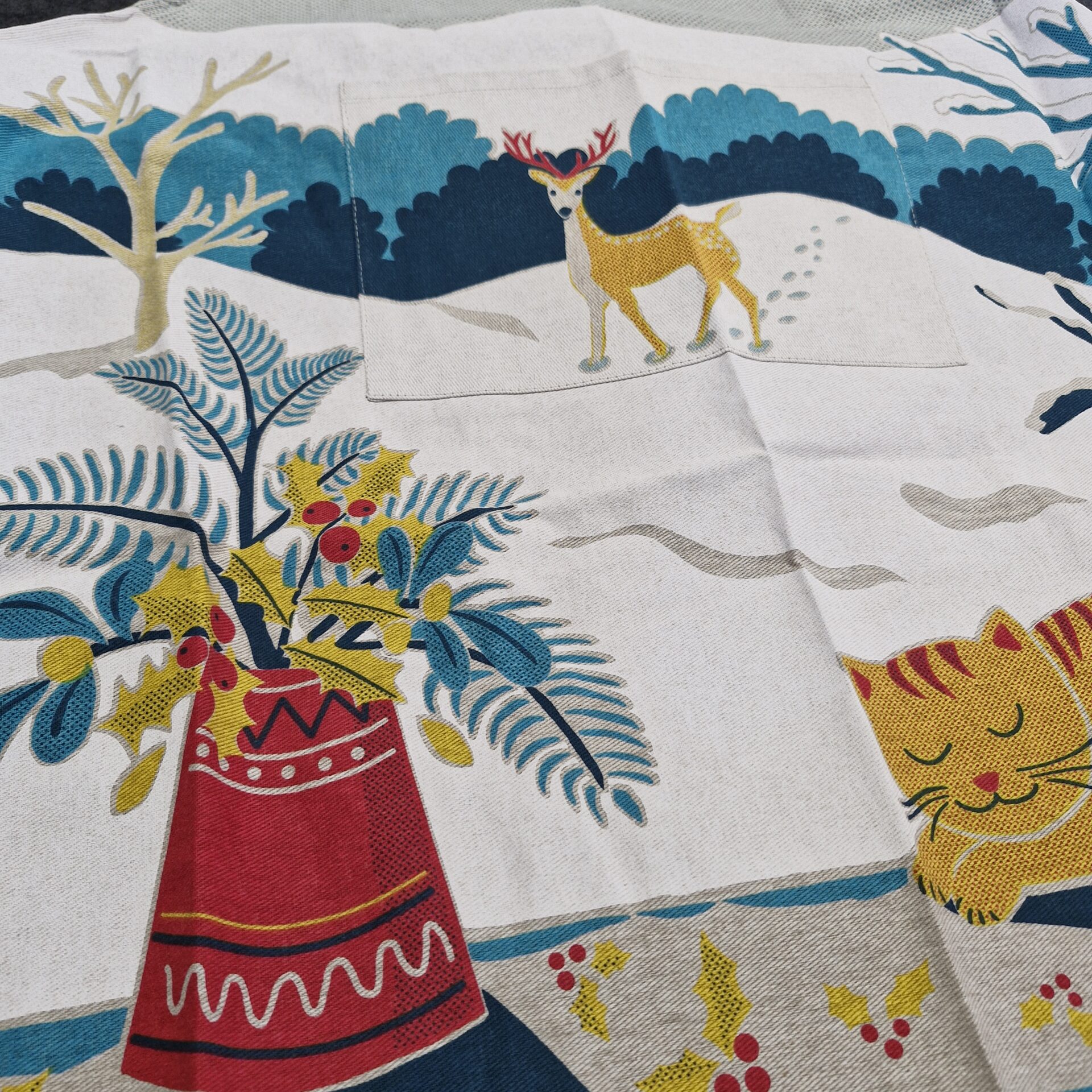 A multicoloured apron featuring a winter scene with snow, a sleeping cat, a squirrel and a bird. A soft and poetic design, perfect for adding a warm and original touch to your kitchen.