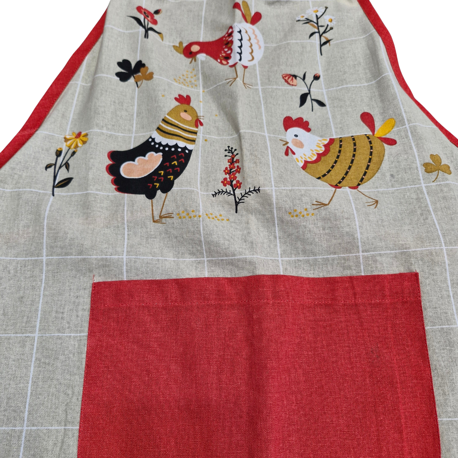 An apron with a beige checkered background featuring a hen motif, accented with red borders. A warm, rustic design, perfect for a cosy, authentic kitchen.