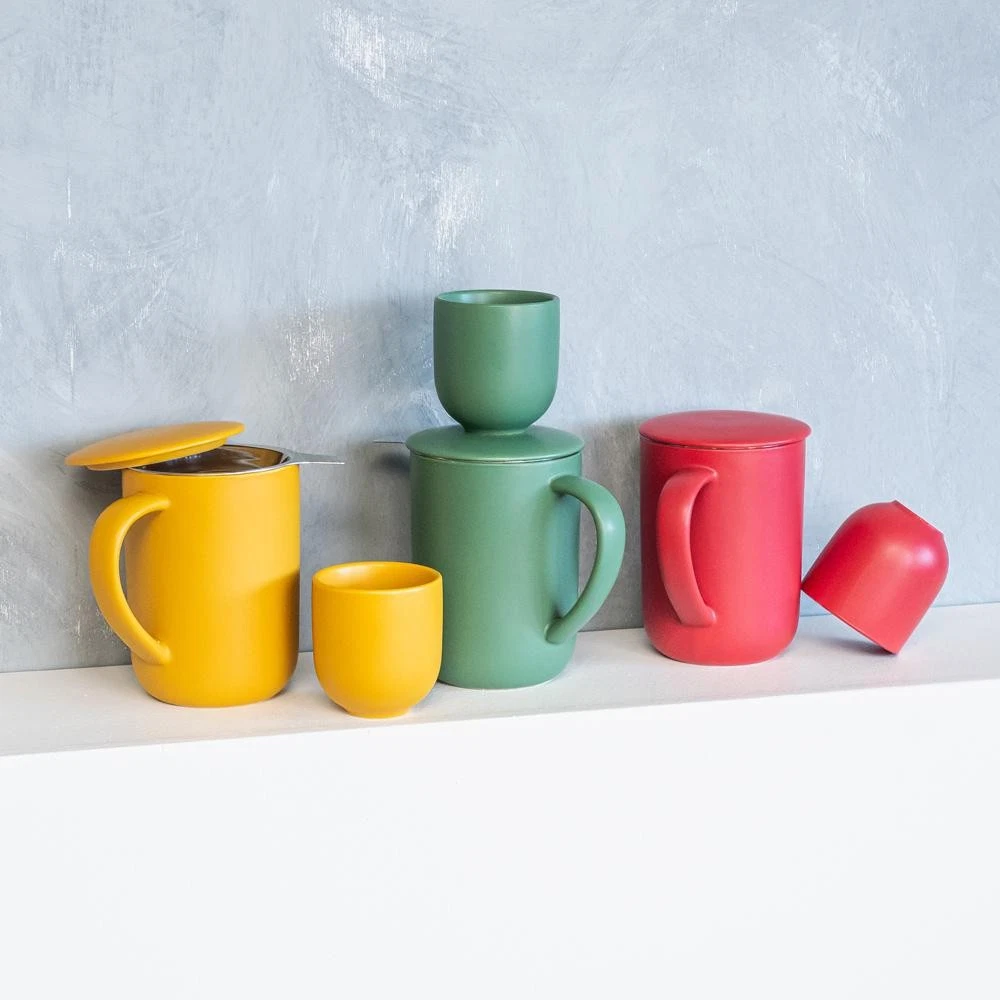 Tisanière en grès avec anse et couvercle Filtre Inox Couleur : jaune Contenance : 470ml Dim : 13.5×8.8 cm Tisanière et filtre : compatible lave-vaisselle pour un entretien sans contrainte