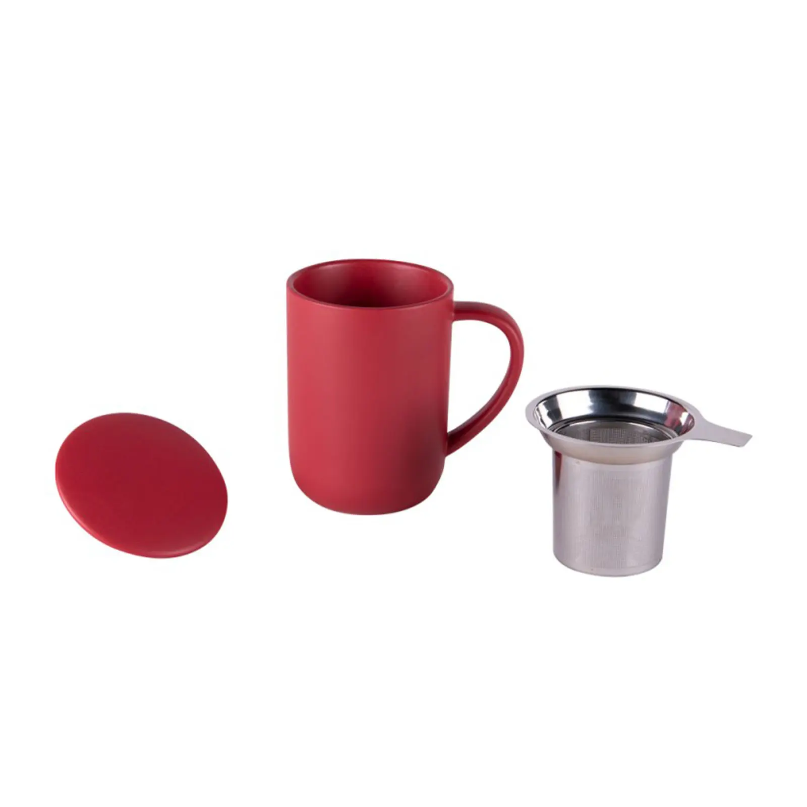 Vibrant charm of deep red combined with the softness of natural stoneware. Generous silhouette designed for tea breaks, at home or in the office. Matt finish, adding texture and character. Discreet and practical stainless steel filter, perfect for loose teas or homemade infusions. Matching lid retains heat and can be used as a filter rest. Thick material for good heat retention and a pleasant feel.