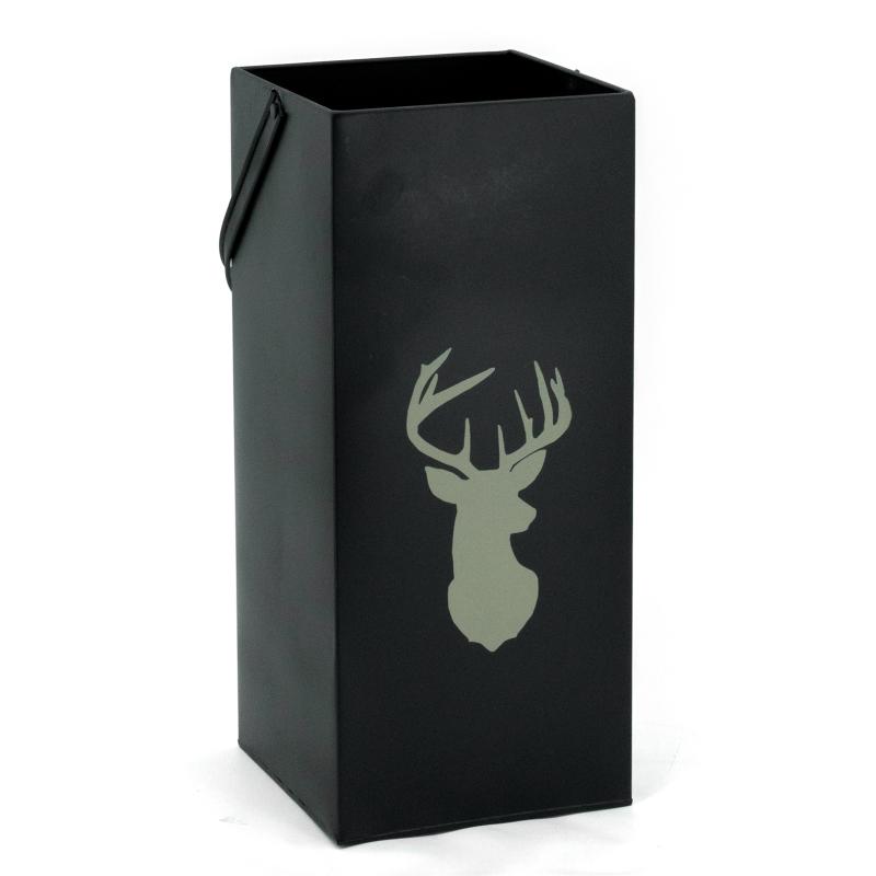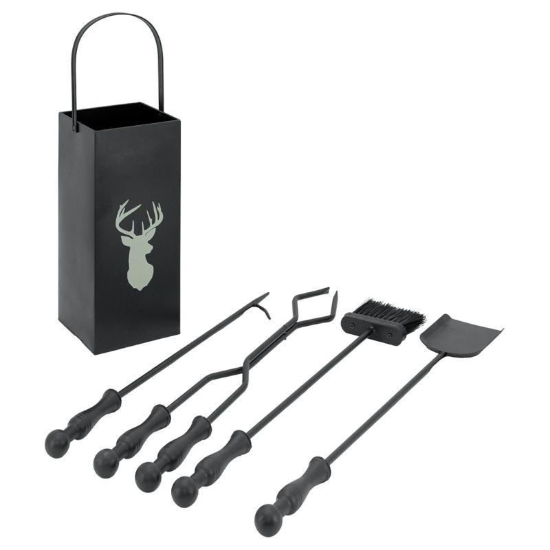 Black metal fireplace tray with a beige stag’s head, complete with four accessories and a handle. Practical and decorative, perfect for an elegant chalet-style look.