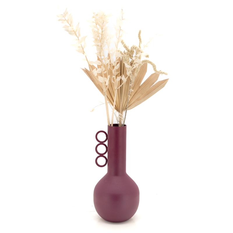 Tonalité profonde et silhouette originale pour ce vase en métal couleur cassis, sublimé par ses anses en forme de boucles. Un objet déco au style à la fois moderne, audacieux et chaleureux, parfait pour rehausser un intérieur contemporain ou naturel. Couleur chaleureuse apportant du caractère et de la singularité à votre décoration. Objet sculptural même sans composition florale.