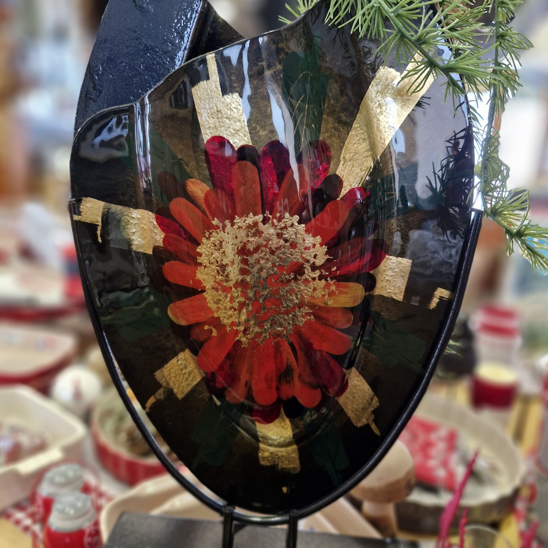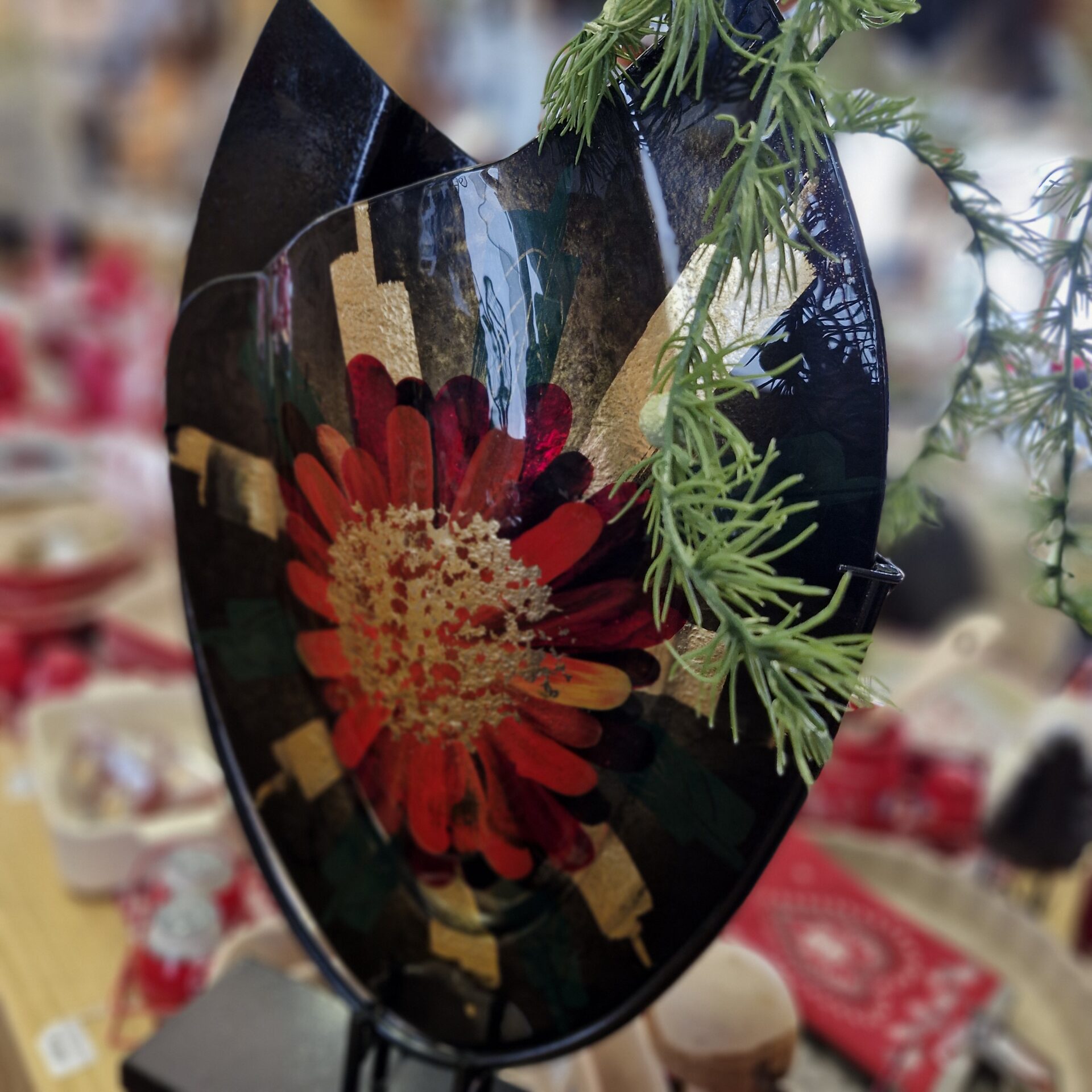 Vase en verre de forme ronde allongée Motif grande fleur rouge et or Socle en métal noir Dim : 33x50cm Ce vase est spécialement conçu pour des bouquets de fleurs séchées et n’est pas étanche : il ne peut donc pas contenir d’eau.