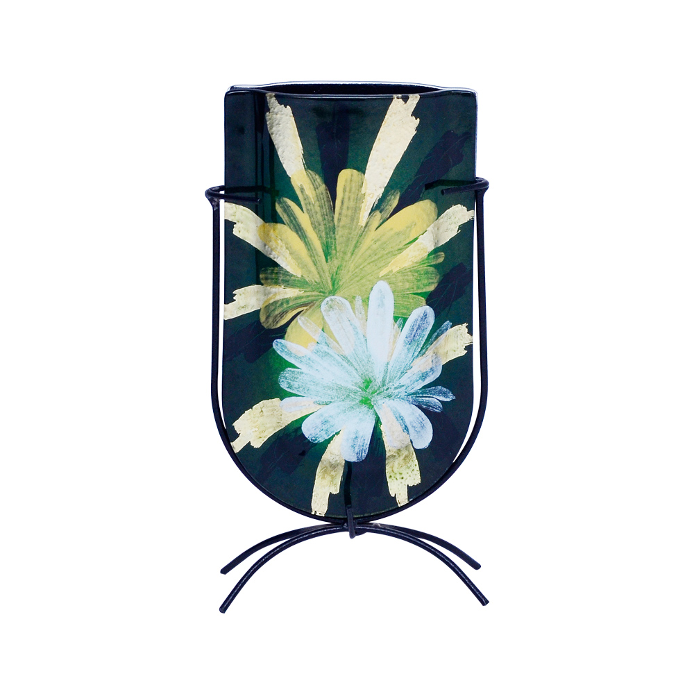 Vase en verre décor peint Couleur vert doré Dim : 33x50cm Socle en métal noir Ce vase ne permet pas de fleurs fraîches, il n’est pas étanche. Pour la décoration uniquement